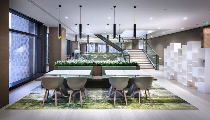 清透的玻璃和充滿生機的綠植墻打造的步行樓梯,以此鼓勵內部人員的流動。同時周邊開放的設計意在創建一種基于動態的工作模式(ABW),通過協作空間將人們聚集在一起。