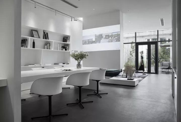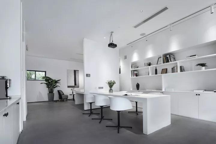 在色彩上,回歸對“無”的一種思考。設計需要一種克制的色彩,而且充滿張力和想象力。在豐富多彩的世界里,白色最接近內心,最為尊貴,也許是最絢麗多彩的顏色。設計師選擇了白色,白色的天花,白色的墻面,白色的家具,少許低飽和度的綠色統一在灰色水泥地面中,形成對比,促進著情緒和情感的激發。