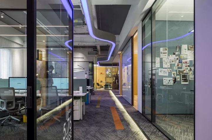 變換色彩的天花燈帶將開放工作站、私密工作站和站立會議室連接,看似互相連通卻又相互獨立,滿足在有限空間中實現功能復合的概念,增加整個空間的靈活性。工作站作為員工的重要工作區域,辦公桌配置智能升降功能,讓員工在坐式辦公和站式辦公隨意切換,減少工作帶來的疲勞。