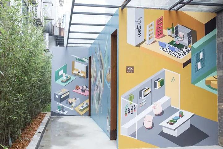 對于戶外,追求“少即是多”的理念,簡約時尚的休閑椅、茶幾和企業形象Pig點綴其中,摒棄了繁雜的裝飾,使整個氛圍變得輕松、愉快,而洗手間區域通過涂鴉將企業創意的想法表達,增加空間的藝術色彩。