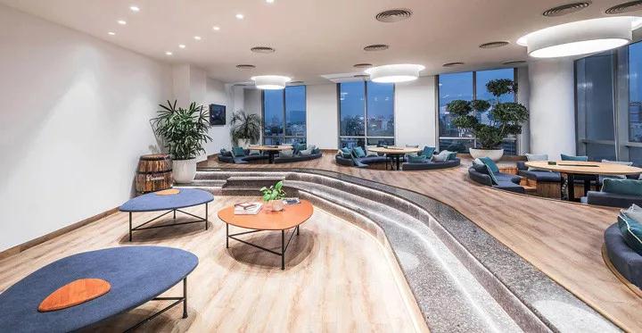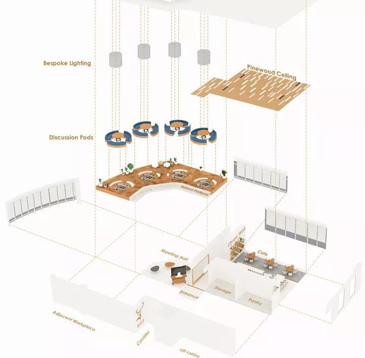 辦公室裝修設計空間被劃分成兩大功能區(qū):會議廳和咖啡活動區(qū)。會議廳將支持市場營銷和業(yè)務開發(fā)團隊的正式討論和演講;而咖啡活動區(qū)則用于半正式和休閑的會議討論,升高的地臺,嵌入的圓形下沉式座位區(qū),配以大型圓木桌和明亮舒適的圓形光照,這里就是會議廳。與眾不同的建筑形式讓這里有著輕松閑適的愜意氛圍,以創(chuàng)新形式鼓勵和促進頭腦風暴和團隊協(xié)作。