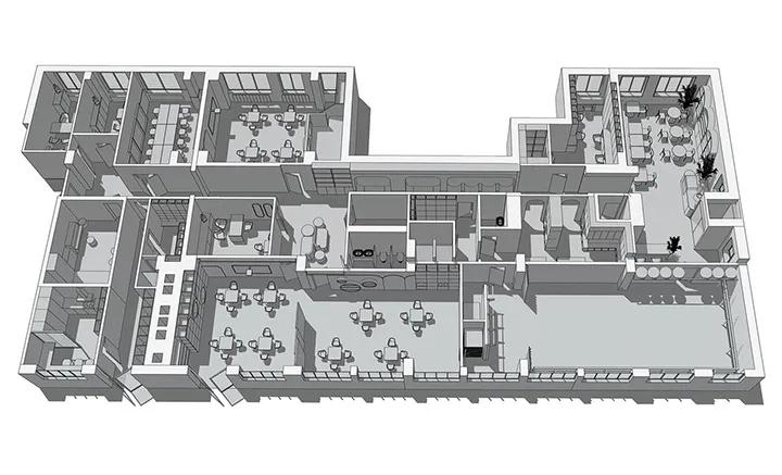 這個500平方米的兒童中心包括以下幾類空間:入口區包括接待處,迷你咖啡館和主題產品店。該空間還有一條主要走廊,通向建筑物另一側的出口,貫穿整個中心。