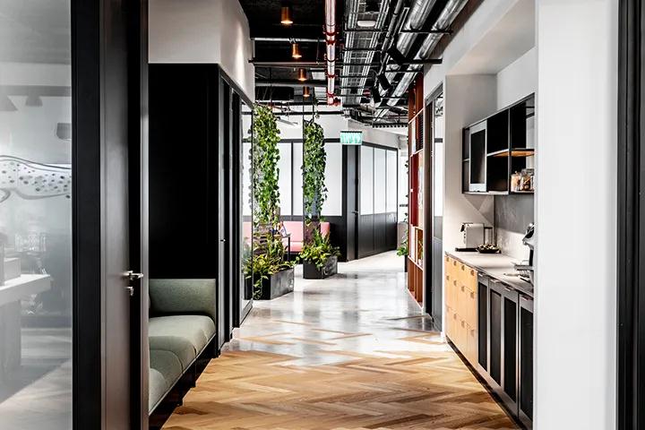 裸露的天花板,半覆蓋的金屬網,懸浮的隔音板天花板,部分地毯,靈活的設計方法營造出有趣而有趣的辦公環境。還仔細考慮了室內裝飾材料的應用。工業質感材料和充滿活力的綠色植物的結合,一方面表明它具有科學和技術特性,另一方面也表明這是一個活潑宜人的地方。