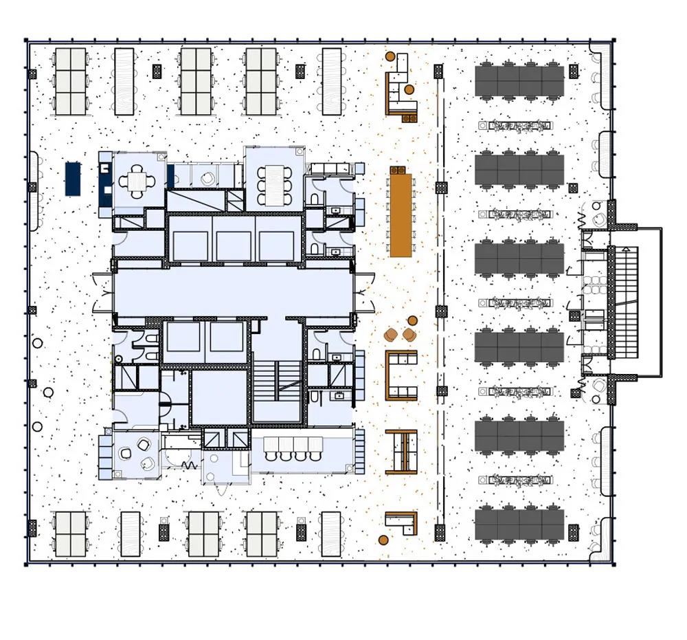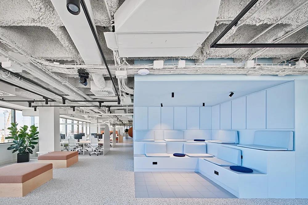 兩層樓由清新的藍(lán)色空間連接。藍(lán)色核心空間包含所有必要的輔助和協(xié)作空間,如會議室、電話亭和廚房。