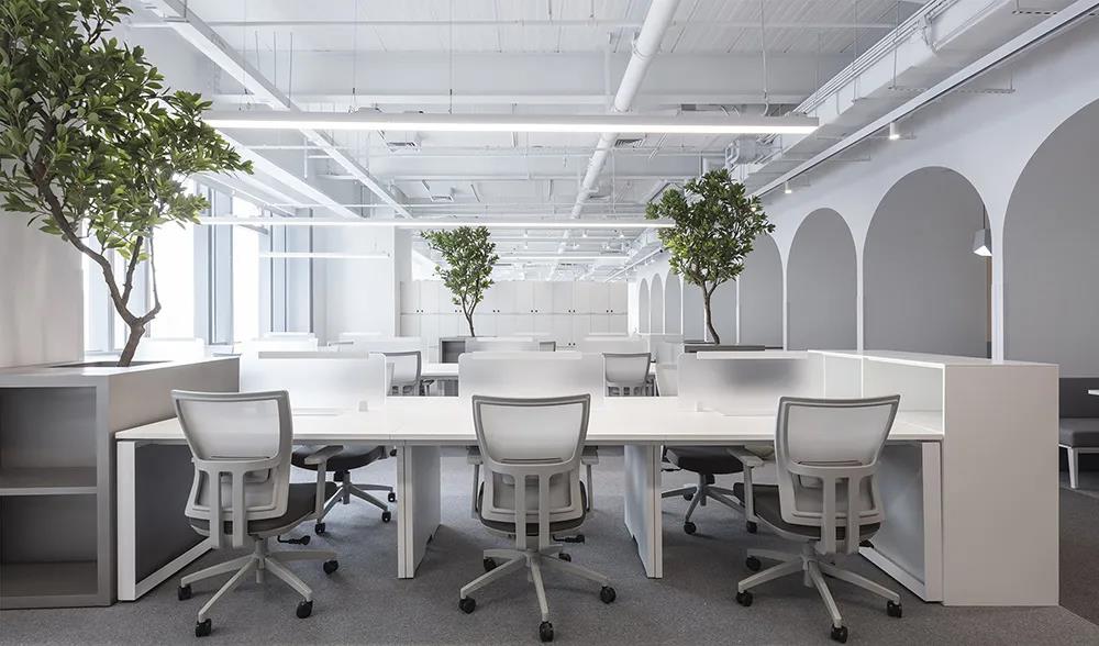 延續(xù)基調(diào)主題,工作區(qū)以白色為主,灰色為輔,以“干凈”“安靜”的空間孕育靈感。為了保證儲物需求,儲物柜巧妙地設(shè)置在地板分散的中間區(qū)域,深圳裝修公司以滿足員工的需求,豐富整個(gè)空間,保持布置整潔。這與白色的噴漆裸天花線條縱橫交錯(cuò),豐富了整個(gè)空間的層次感。